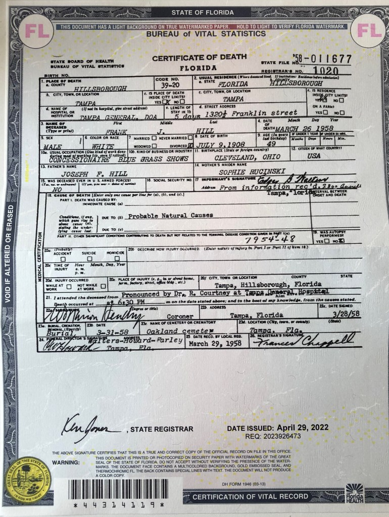 My mother told me when I was eleven that my name wasn’t really Hill. She had written down a name she found in an obituary, but it was wrong. In my thirties, I became very tired of the blandness of “Hill.” I decided to find my true surname. I knew my father’s parents changed it. So, I wrote a letter to the pastor at the church where my grandmother told me she and grandpa wed, requesting a copy of his marriage registry on October 10, 1917. The pastor wrote back. He sent me this: